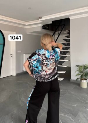 This avant-garde two-piece set is designed for boutique owners looking to offer unique, high-street fashion. The ensemble features a distressed acid-wash finish with intricate geometric square cutouts and decorative chain accents on both the top and the ankles of the trousers. It provides a bold, contemporary silhouette that stands out in any retail display.