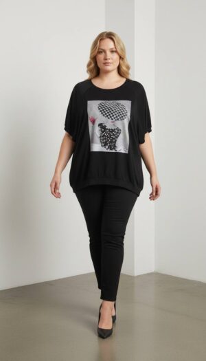 – Style: Off-shoulder graphic tee and wide-leg pants