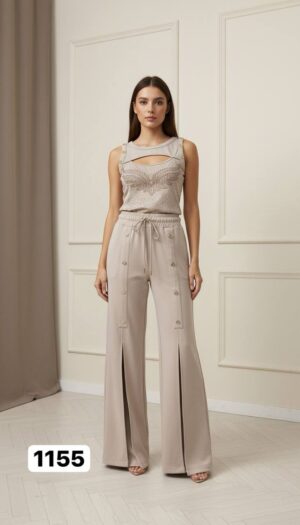 Embellished Wing Motif Top & Studded Wide-Leg Pant Set